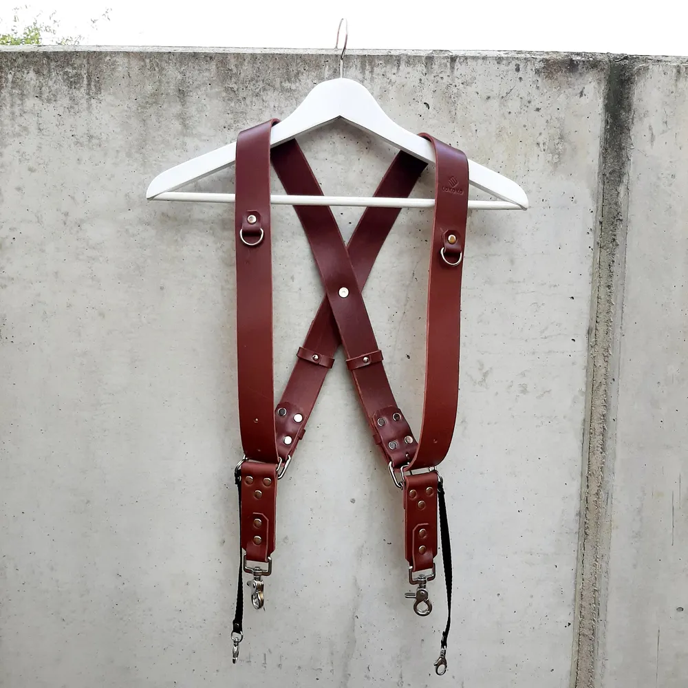 Na popruh z vysoce kvalitní hovězí usně připnete dva fotoaparáty. Systém křížení popruhů do X je při nošení velmi pohodlný a rovnoměrně rozděluje zátěž, díky čemuž se vyhnete bolesti krku a ramen. Jednotlivé popruhy mají šířku 38 mm.