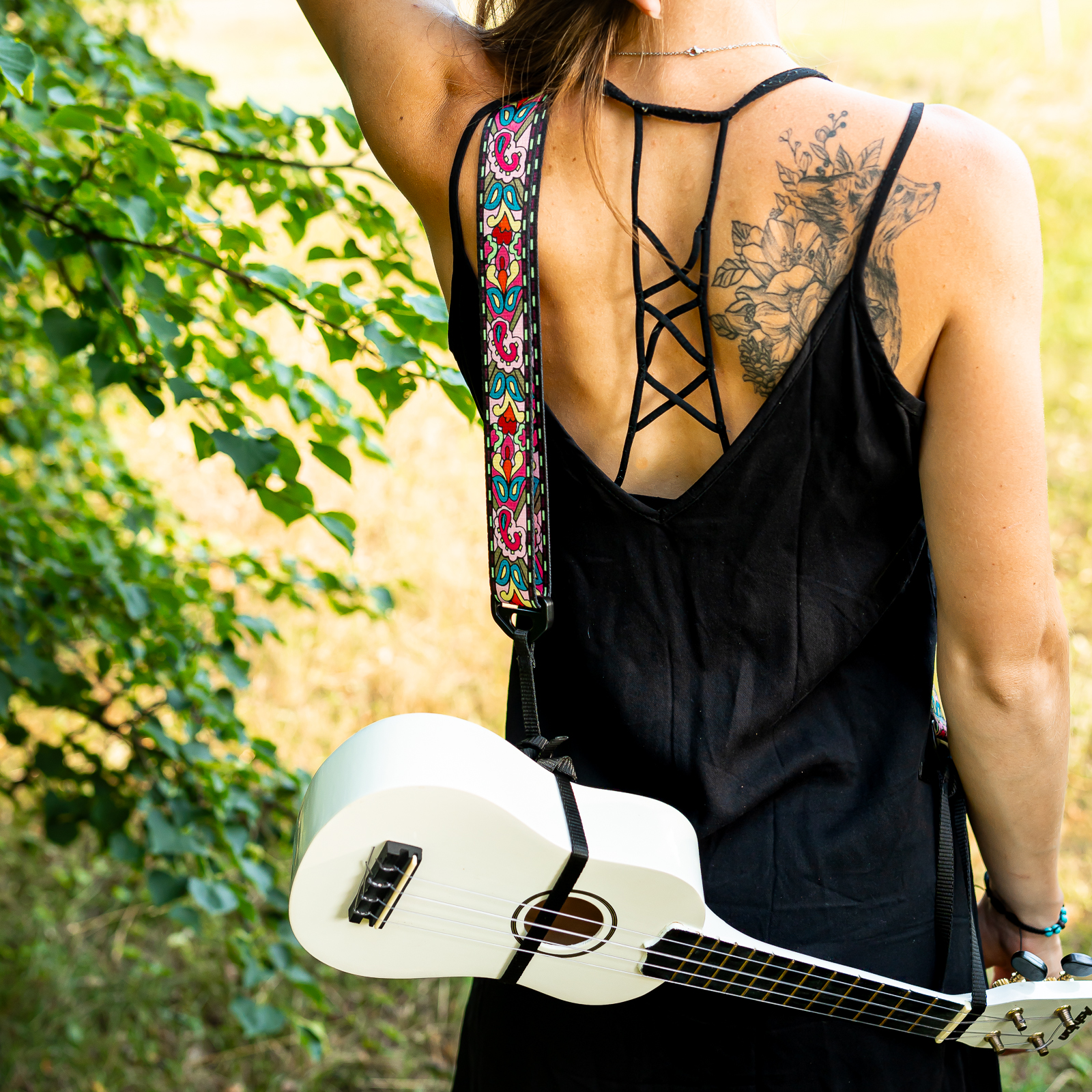 Popruh je vyrobený v České republice a prošel rukama zkušených řemeslníků Lenky a Veroniky. Jednu stranu nylonového pásku upevníte okolo těla ukulele pomocí plastového zkracovače, druhou pomocí zkracovače na krk či hlavu ukulele. Designovou část lze zkrátit / prodloužit dle preferencí muzikanta.